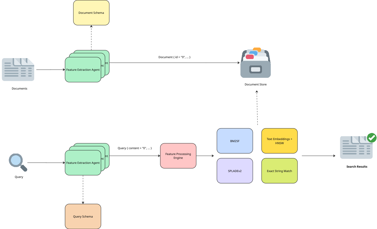 - Retrieval Agents: Modular implementations of retrieval algorithms (e.g., BM25F, HNSW, Reciprocal Rank Fusion, Regex).